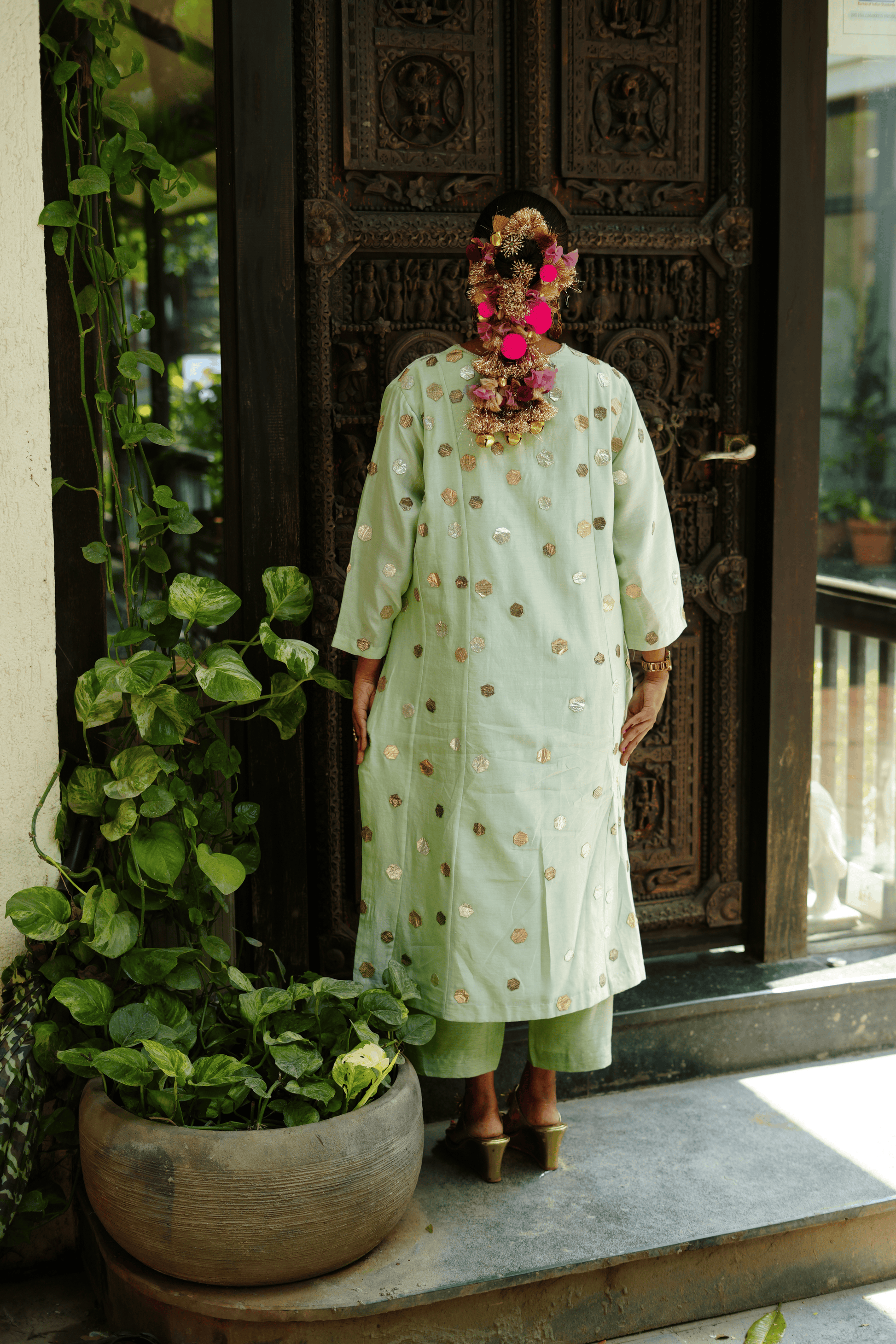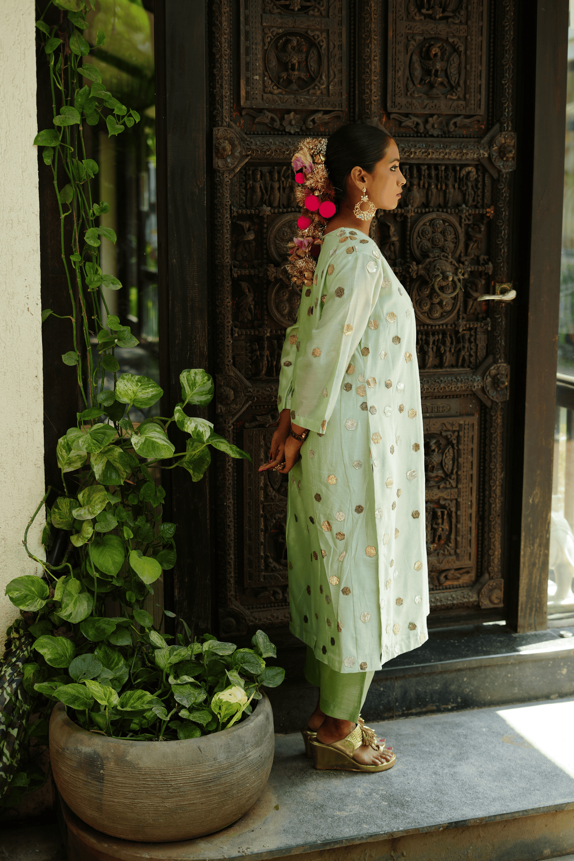 Crafted from exquisite, feather-light Silk Chanderi fabric, the JAYANTI BEGAM SET is the centerpiece of our festive Begam collection, designed to make every celebration special. This piece is lavishly adorned with traditional Gota Work detailing, offering a shimmering, regal elegance that beautifully complements the vibrant colors of the season.