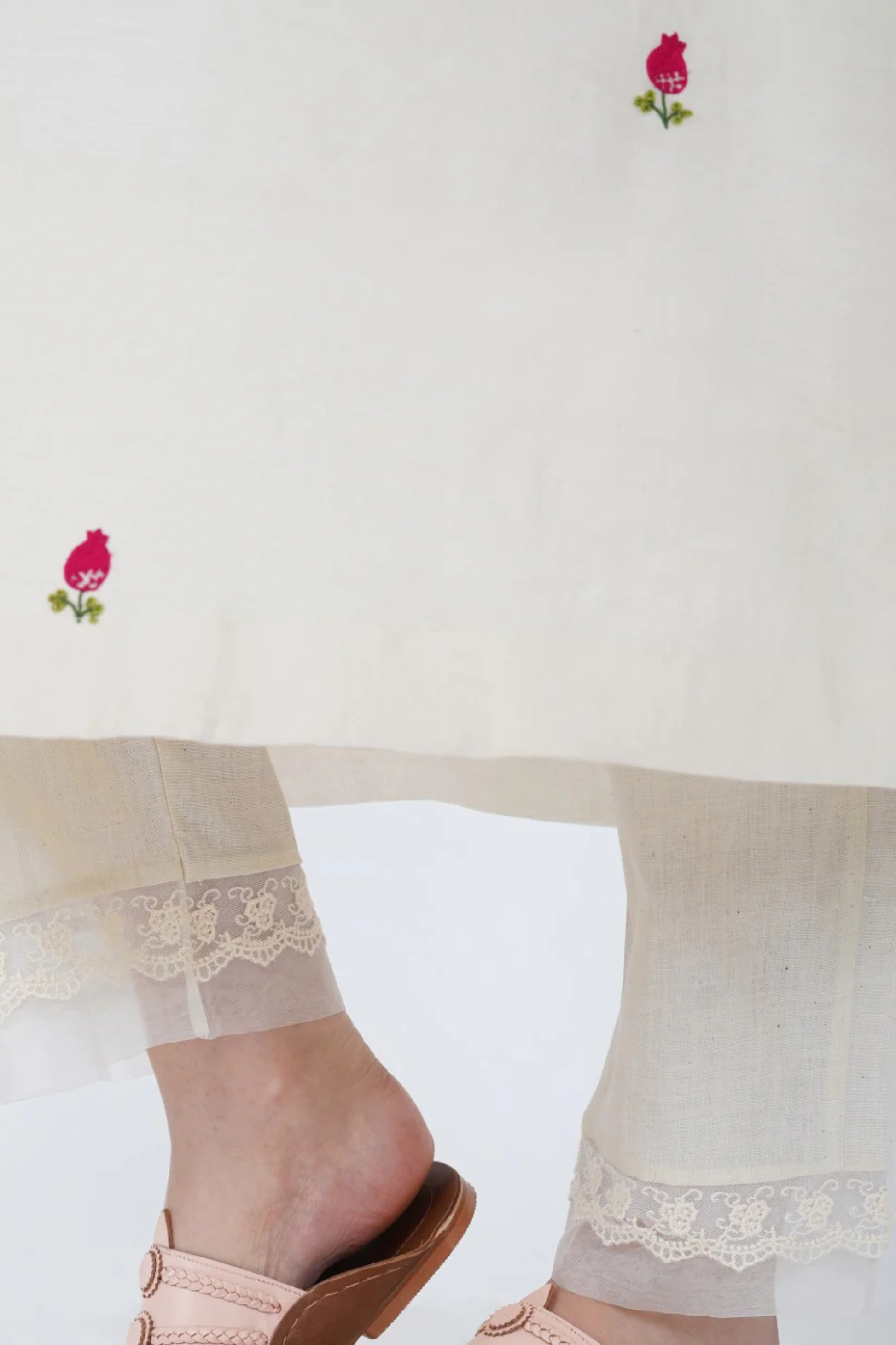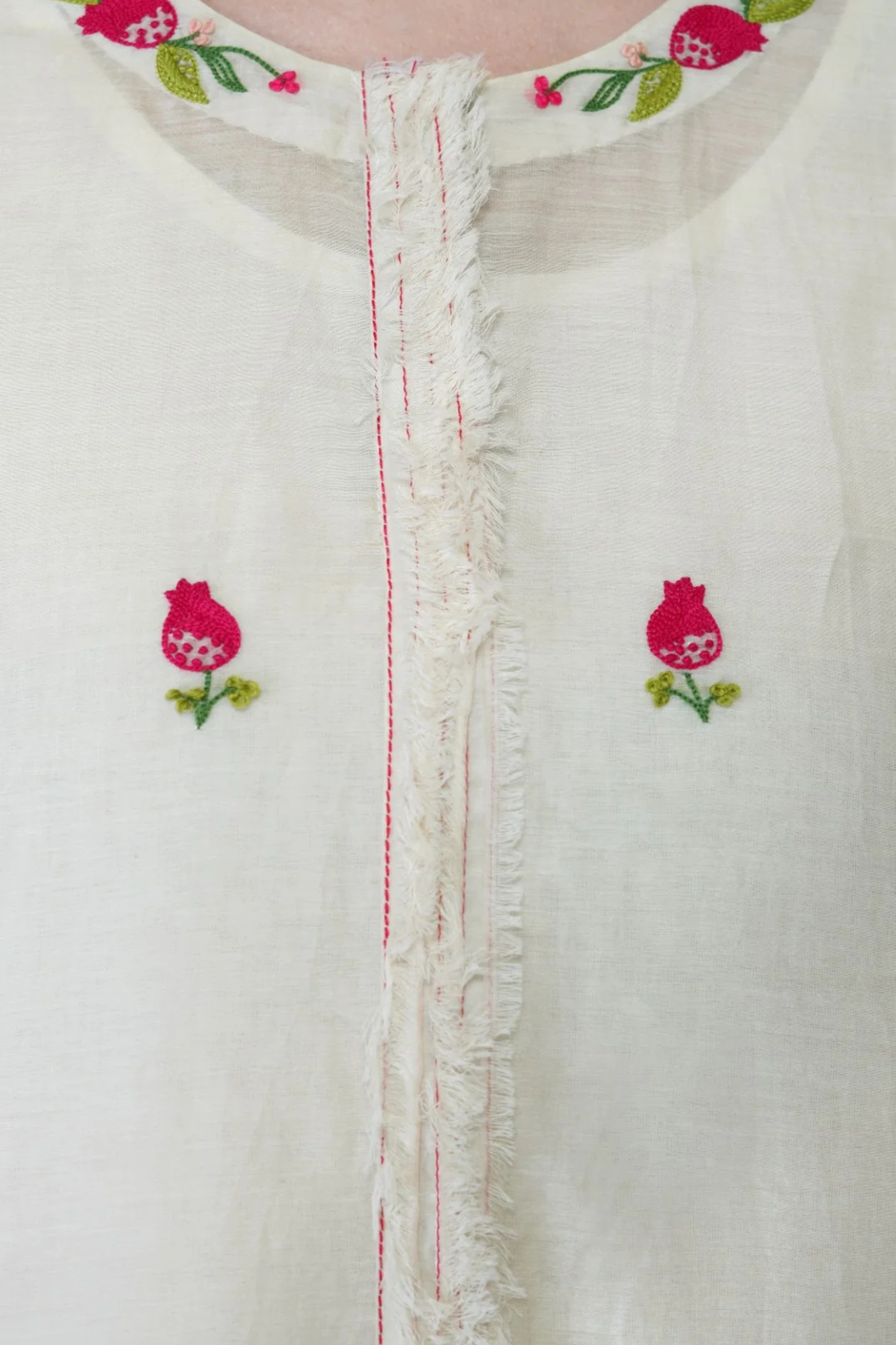 A dash of oriental style to the classic wardrobe staple. The off white chanderi kurta with anar motif in subtle hues and stitch detailing adds to the subtle beauty of this piece. Cut in a comfortable a line silhouette with side slits, this piece is best paired with off-white pants and slip-on shoes for a chic ensemble.