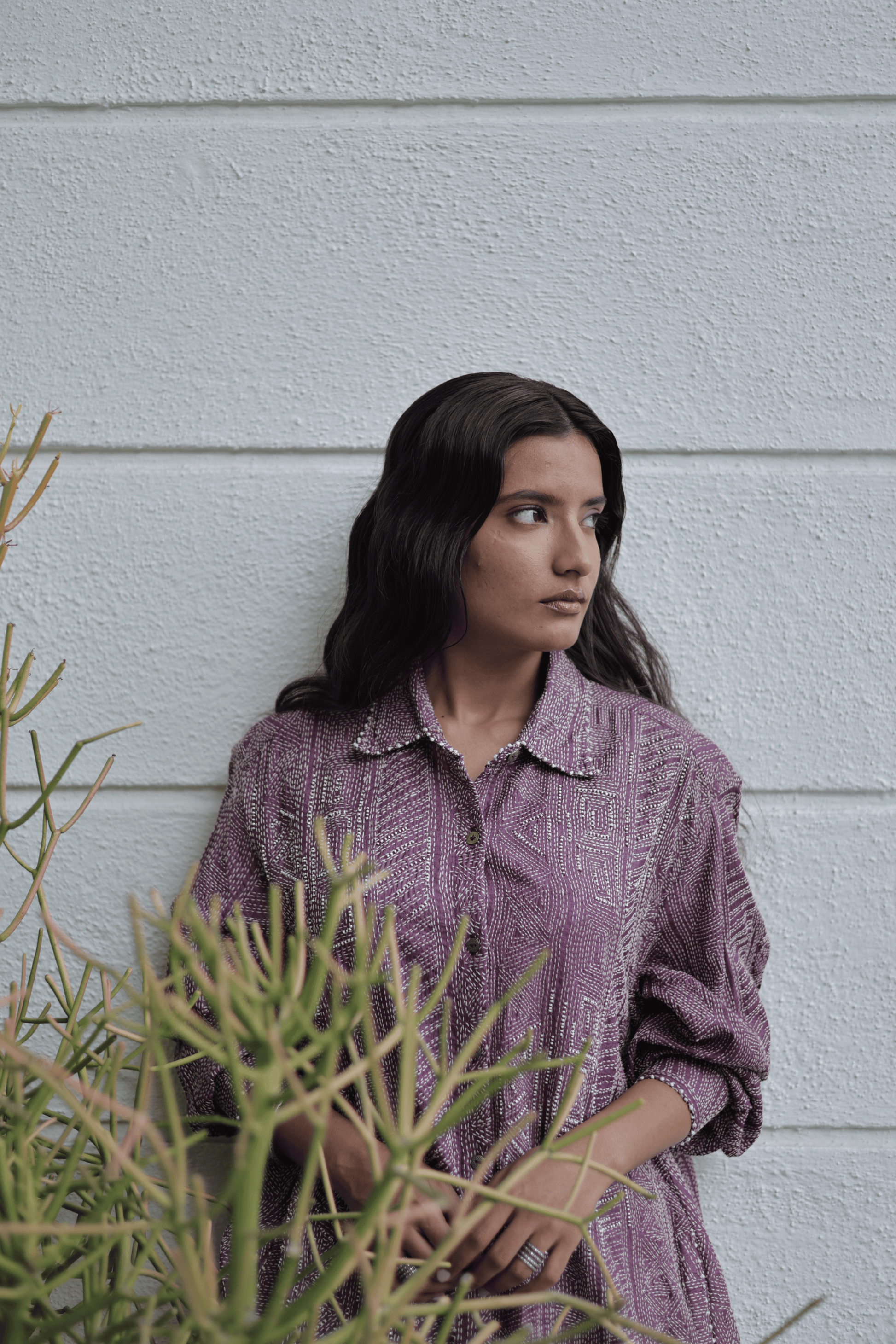 Crafted in pure tassar silk, this piece is defined by the quiet rhythm of all-over kantha stitching, hand-worked to create depth without weight. The surface is gently interrupted with barely-there bead accents, placed in scattered patches, meant to be discovered only up close.